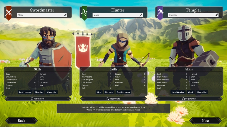 游戏受到同类作品中众多经典之作的启发,但整体上更易于上手。你将控制一支刚刚在一座程序生成的岛屿上登陆的冒险者小队,管理他们的各种需求、心情、特性与社交,同时探索岛屿和地下城。