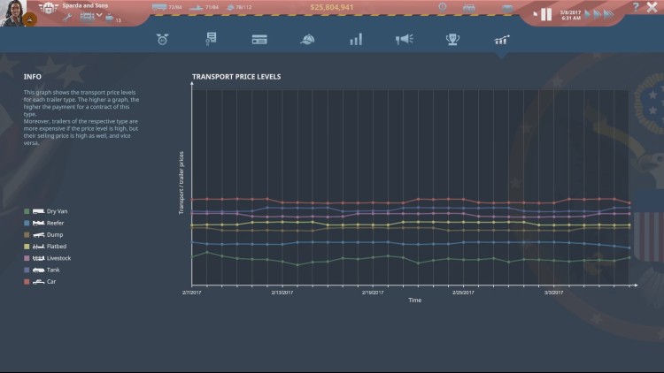 一辆美国卡车还不够吗?那么,100辆怎么样?管理您不断壮大的卡车车队,拥有数十辆卡车和拖车,并将它们运送到美国各地。巧妙地分配合适的卡车,避免空载行程,赚取真正的巨额利润!通过购买拖车特许权来解锁新类型的商品,并吸引新客户。在复杂的模拟经济环境中,将关键行业与其供应商联系起来。