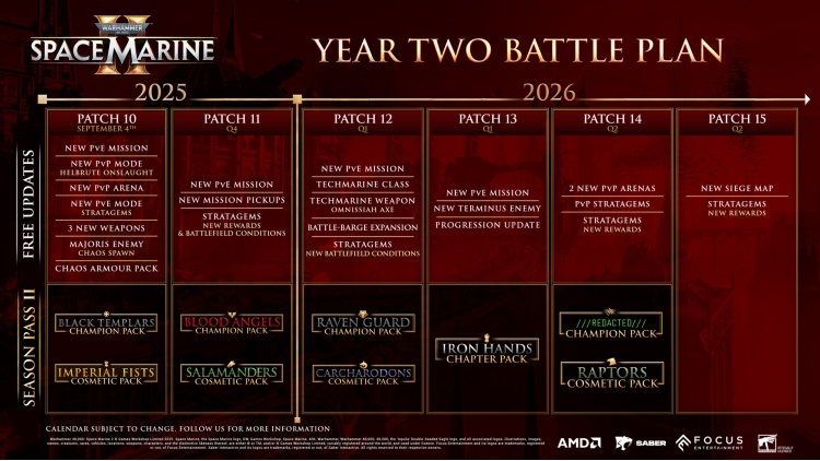 Warhammer 40,000: Space Marine 2 © Games Workshop Limited 2024. Space Marine, the Space Marine logo, GW, Games Workshop, Space Marine, 40K, Warhammer, Warhammer 40,000, 40,000, the ‘Aquila' Double-headed Eagle logo, and all associated logos, illustrations, images, names, creatures, races, vehicles, locations, weapons, characters, and the distinctive likeness thereof, are either ® or TM, and/or © Games Workshop Limited, variably registered around the world, and used under licence. Focus Entertainment and its logos are trademarks, registered or not, of Focus Entertainement. Saber Interactive and its logos are trademarks, registered or not, of Saber Interactive. All rights reserved to their respective owners.