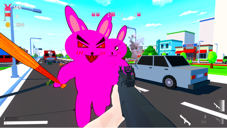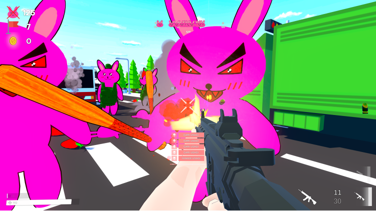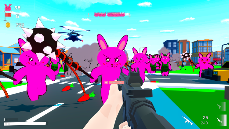 而你——一个神秘的动漫少女,不知为何被卷入了消灭这些兔子的任务。十个关卡,每个关卡十轮。前九轮是越来越得意忘形的兔子,最后是一场疯狂的 Boss 战,感觉就像有人在设计文档里随便按了个“随机”键就直接发布了。